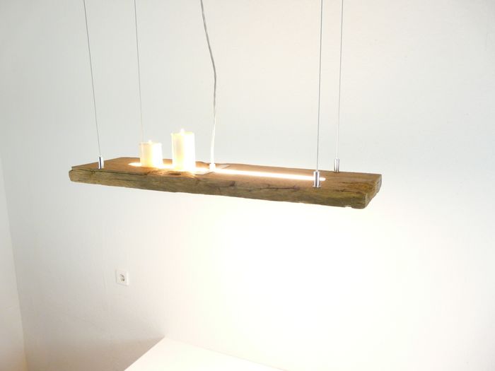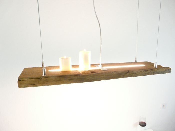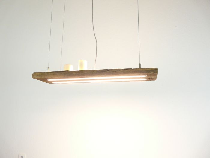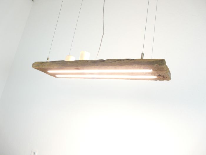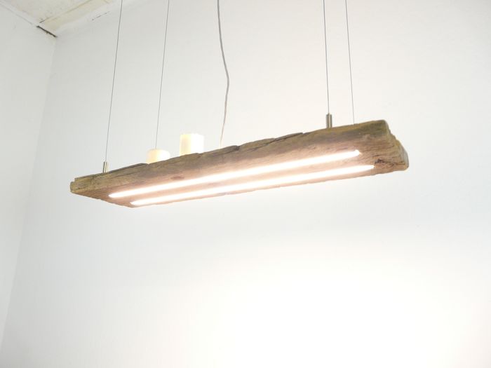 Ein mehrere hundert Jahre alter Holzbalken wurde zu einer wunderschönen Lampe in Handarbeit gefertigt.