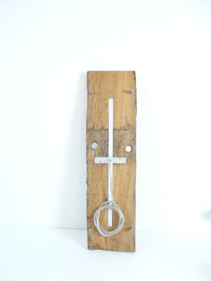 Die Holzoberfläche des Eichenbalkens wurde naturbelassen und dadurch zeigt sich gerade die antike Maserung des Eichenholzes. Durch die hauchdünnen Drahtseilabhängungen scheint die Leuchte förmlich im Raum zu schweben.