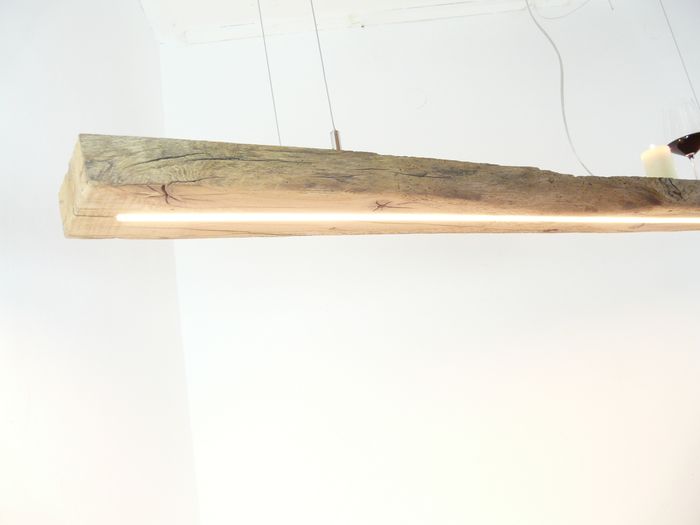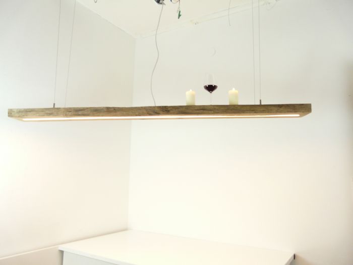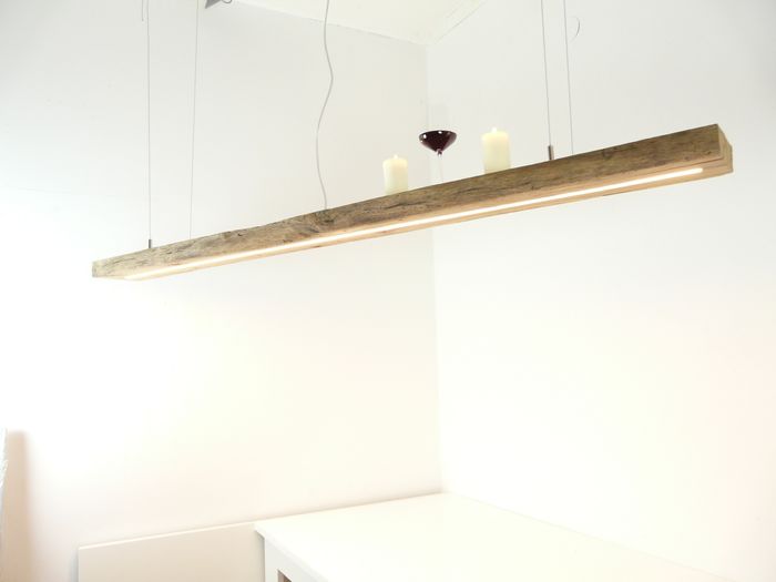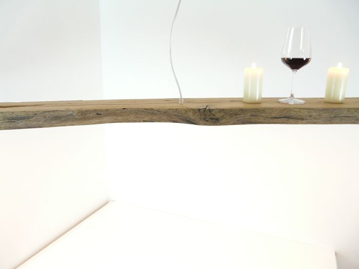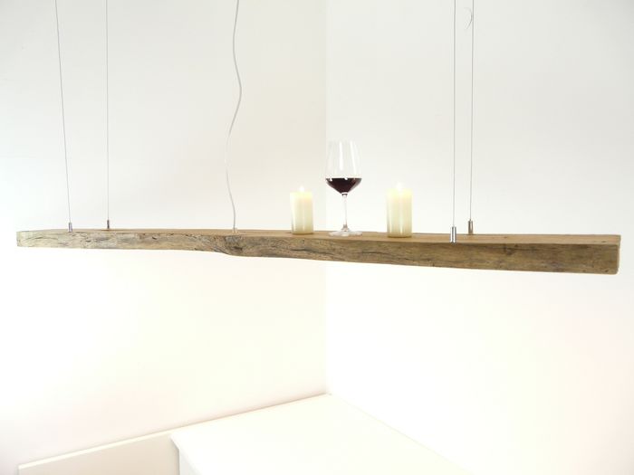 Ein mehrere hundert Jahre alter Holzbalken wurde zu einer aussergewöhnlichen Lampe gefertigt. Dieses Unikat zieht die Blicke als Hängelampe auf sich! Einfach ungewöhnlich rustikal und einzigartig. Durch die hauchdünnen Drahtseilabhängungen scheint die Leuchte förmlich im Raum zu schweben. Die Zuleitung wurde mittig herausgeführt. Die Holzoberfläche wurde naturbelassen