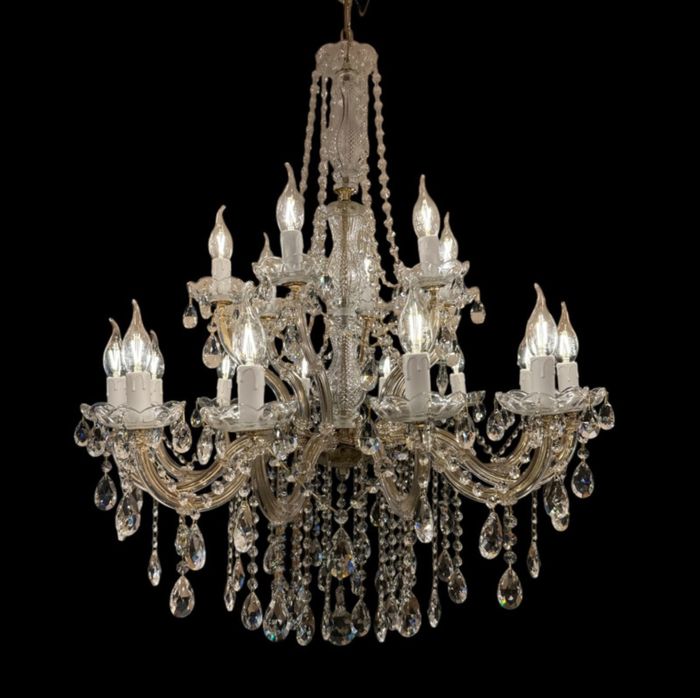 Dieser traumhaft schöne klassische 18-armige Kronleuchter ist mit hunderten Kristallglasanhängern behangen. Die Kerzenschalen und Mittelsäule sind aus italienischem Glas. Der gesamte Behang ist aus unserem Kristallglas TRAUMKRISTALL©. Besonders gut ist der Kronleuchter für Räume zwischen 20 bis 40m² geeignet. Die 18 Arme dieses Kronleuchters und der Durchmesser von 75 cm lassen ihn besonders prachtvoll erscheinen!
