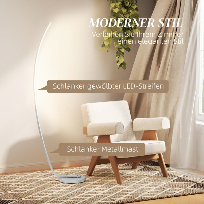 Erhellen Sie Ihre Räume stilvoll mit der HOMCOM Stehlampe für Wohnzimmer. Der hohe, einzigartig gebogene LED-Streifen der Bogenlampe sorgt für effizientes, natürliches Licht und moderne Atmosphäre in Wohn- oder Schlafräumen. Die Helligkeit der dimmbaren Stehlampe lässt sich einfach per Fussschalter regulieren und das robuste Metallgestell verspricht hohe Stabilität. Eine elegante Bereicherung für Ihr Zuhause.