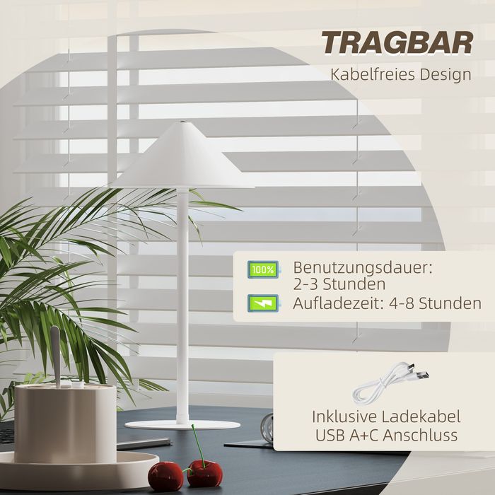 LED-Tischlampe mit USB-Kabel, Touchschalter, Metall, wiederaufladbar, Weiss